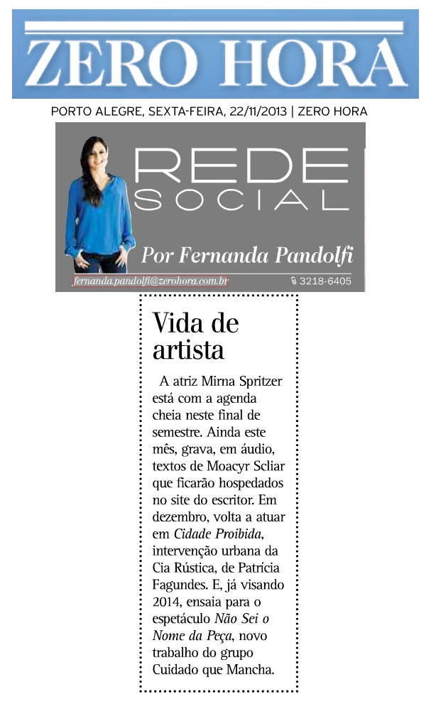Vida de Artista 23 sábado nov 2013 Posted by mirna57 in Uncategorized ≈ Deixe um comentário Cidade Proibida, 5,6,7 e 8 de dezembro, na Redenção. Site do Moacyr Scliar, final de novembro no ar.