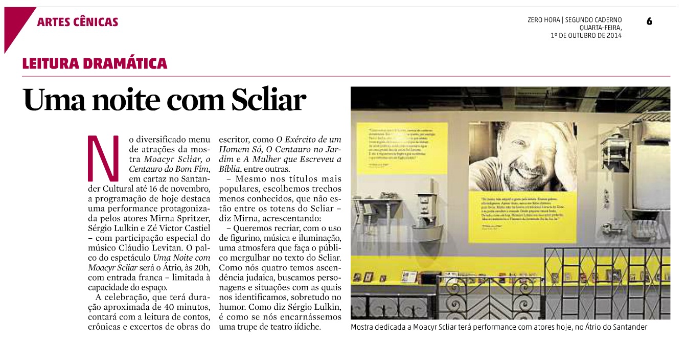 Uma noite com Moacyr Scliar na imprensa 01 quarta-feira out 2014 Posted by Bruna Paulin in Na Mídia, Teatro ≈ Deixe um comentário TagsClaudio Levitan, Clipping, Jornal do Comércio, Mirna Spritzer, Moacyr Scliar, Moacyr Scliar o Centauro do Bom Fim, Na imprensa, O Sul, Santander Cultural, Sergio Lulkin, Uma Noite com Moacyr Scliar, Zé Vitor Castiel, Zero Hora