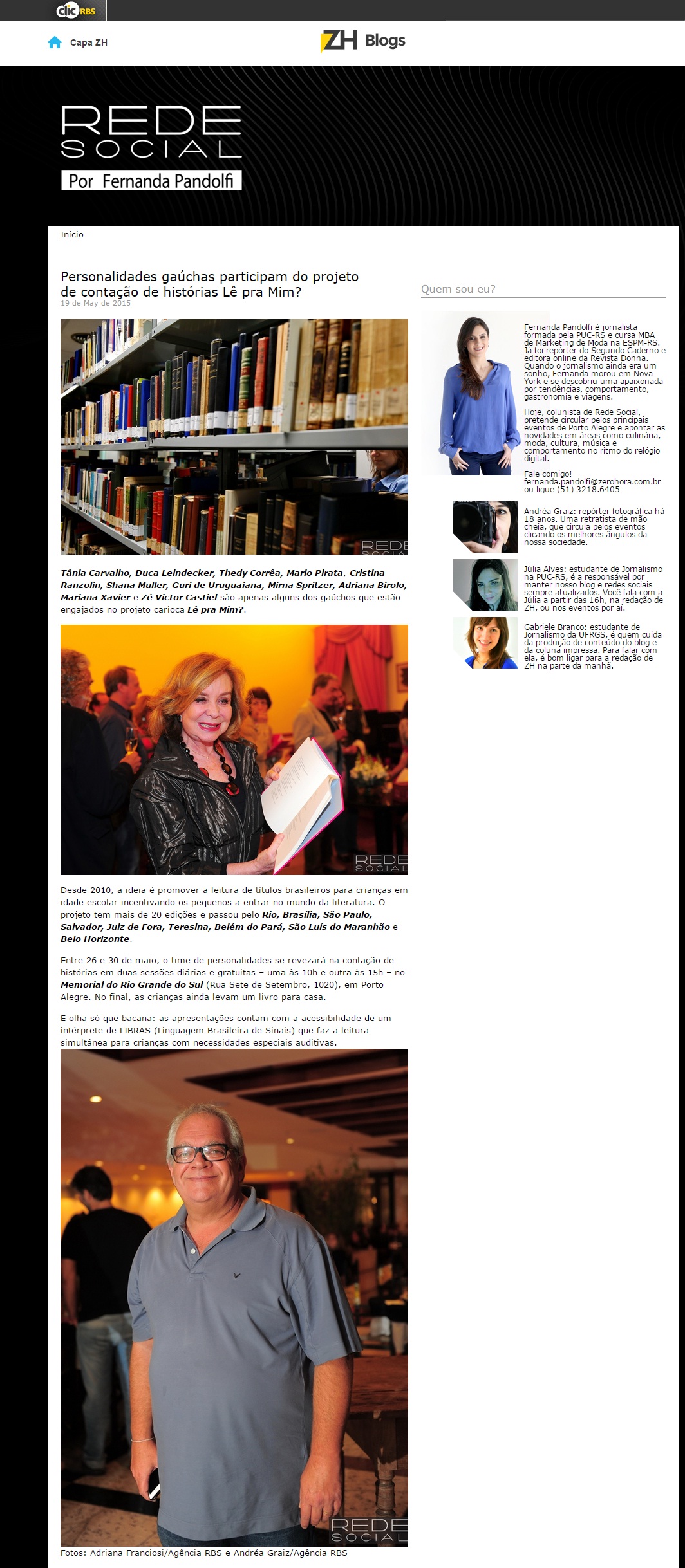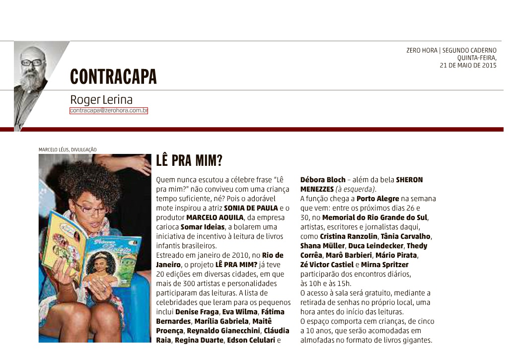 Lê pra mim? 25 segunda-feira maio 2015 Posted by Bruna Paulin in Na Mídia ≈ Deixe um comentário TagsContracapa, Lê pra mim?, Mirna Spritzer, Na imprensa, Rede Social, Zero Hora