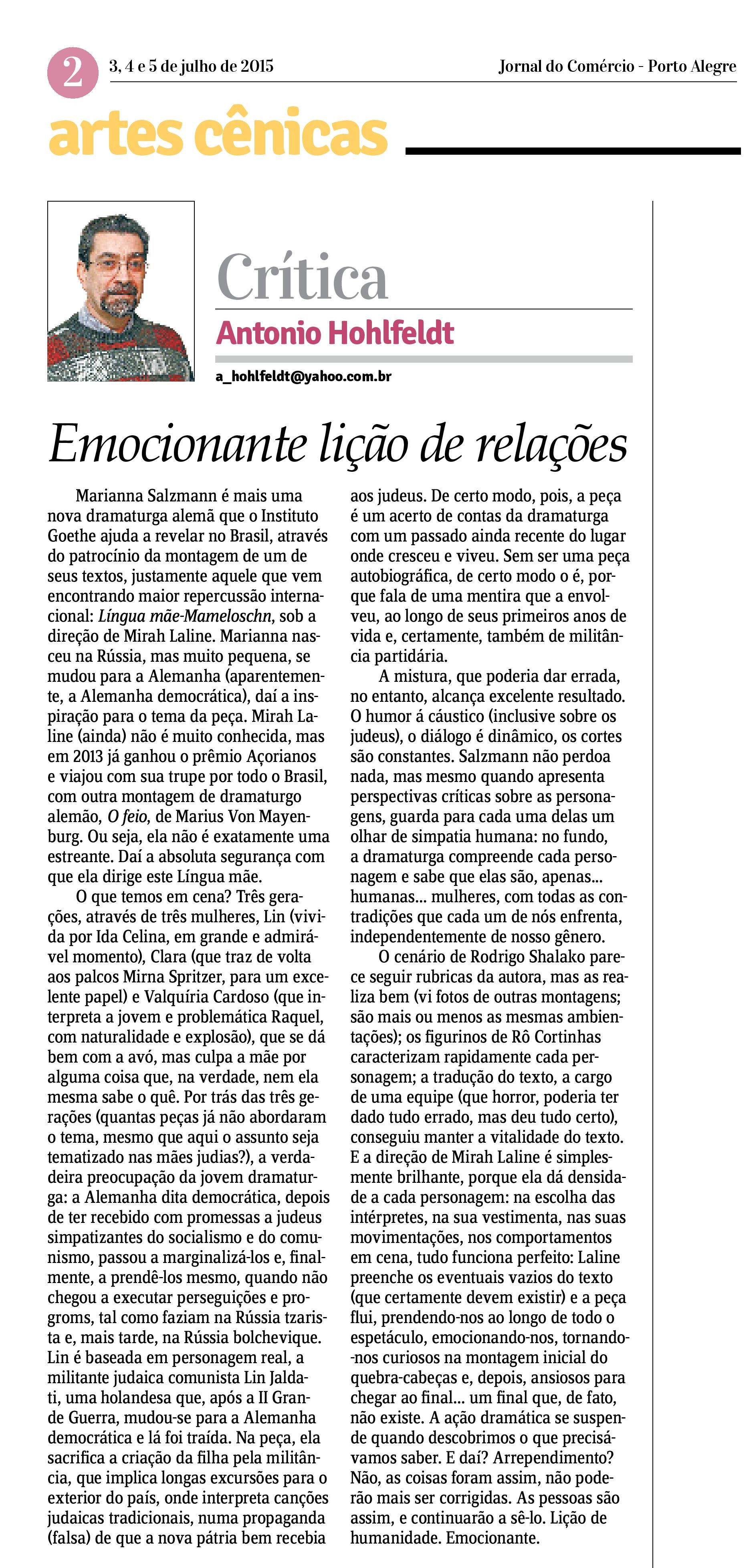 Antônio Hohlfeldt, Clipping, Crítica, Jornal do Comércio, Língua Mãe.Mameloschn, Mirna Spritzer, Na imprensa